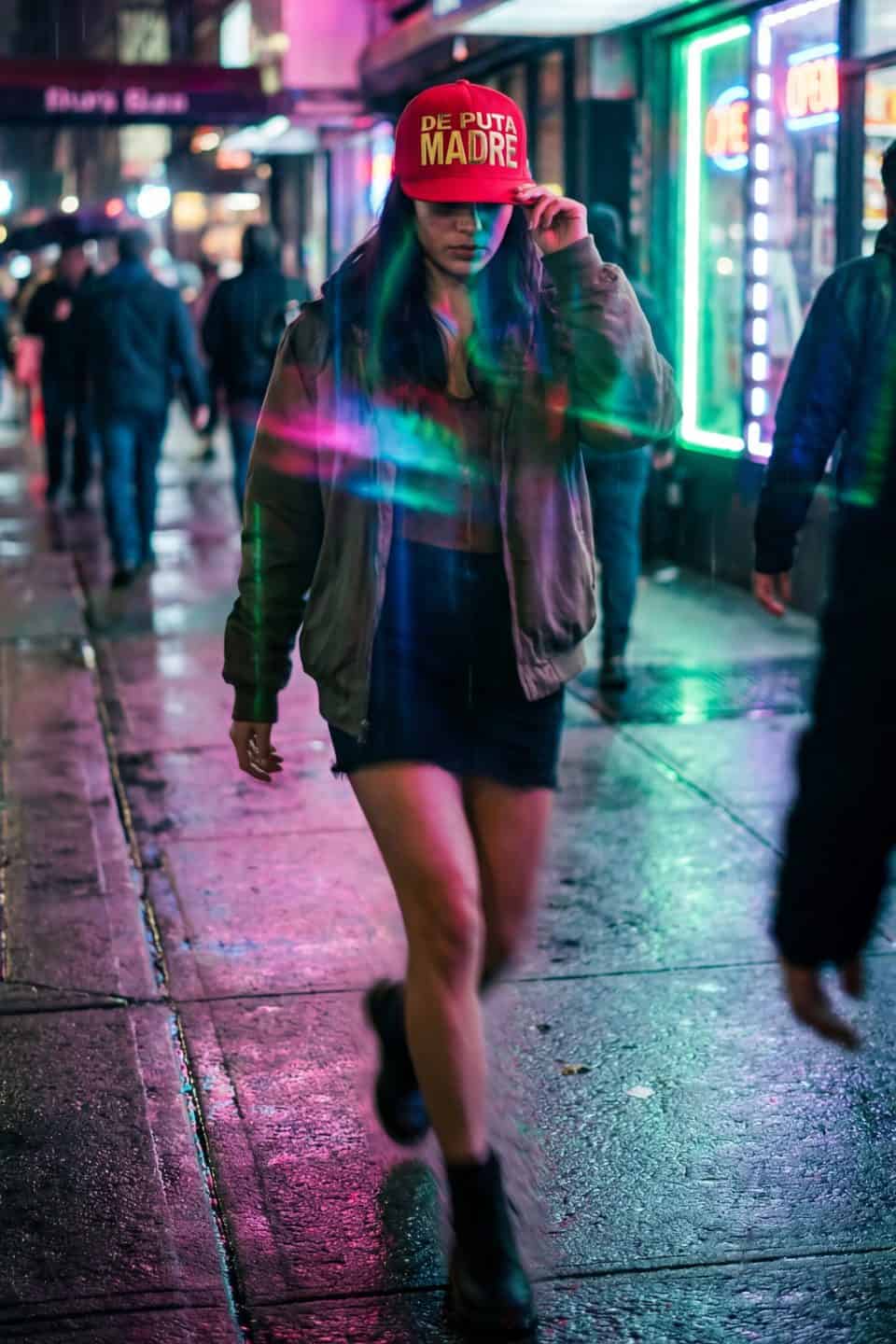 Bold black streetwear cap with gold lettering by De Puta Madre 69, Italian urban luxury fashion brand.Bold streetwear model in NYC nightlife scene, wearing De Puta Madre 69 apparel.